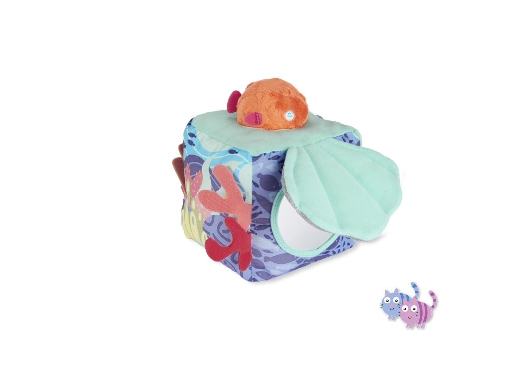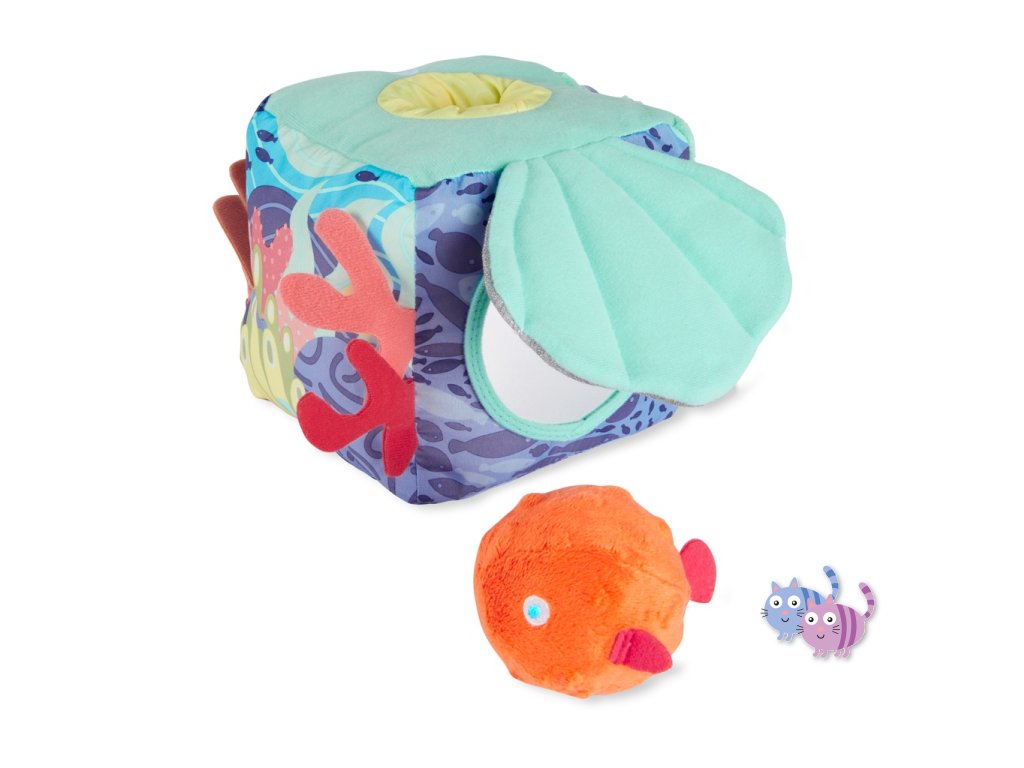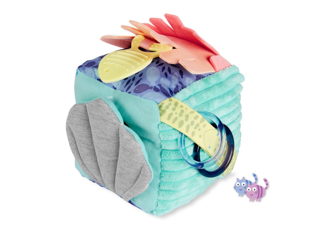 Ponořte se do nekonečné zábavy! Naše měkká kostka aktivit inspirovaná mořem, která je plná více měkkých textur, zvuků šustění a dalších věcí, které může dítě prozkoumat, podporuje vícesmyslové zkoumání během hry. Obsahuje rybí chrastítko, pomačkanou skořápku se skrytým dětským zrcátkem, hračku na kousání ryb a mnoho dalších oceánských pokladů, které můžete objevit.