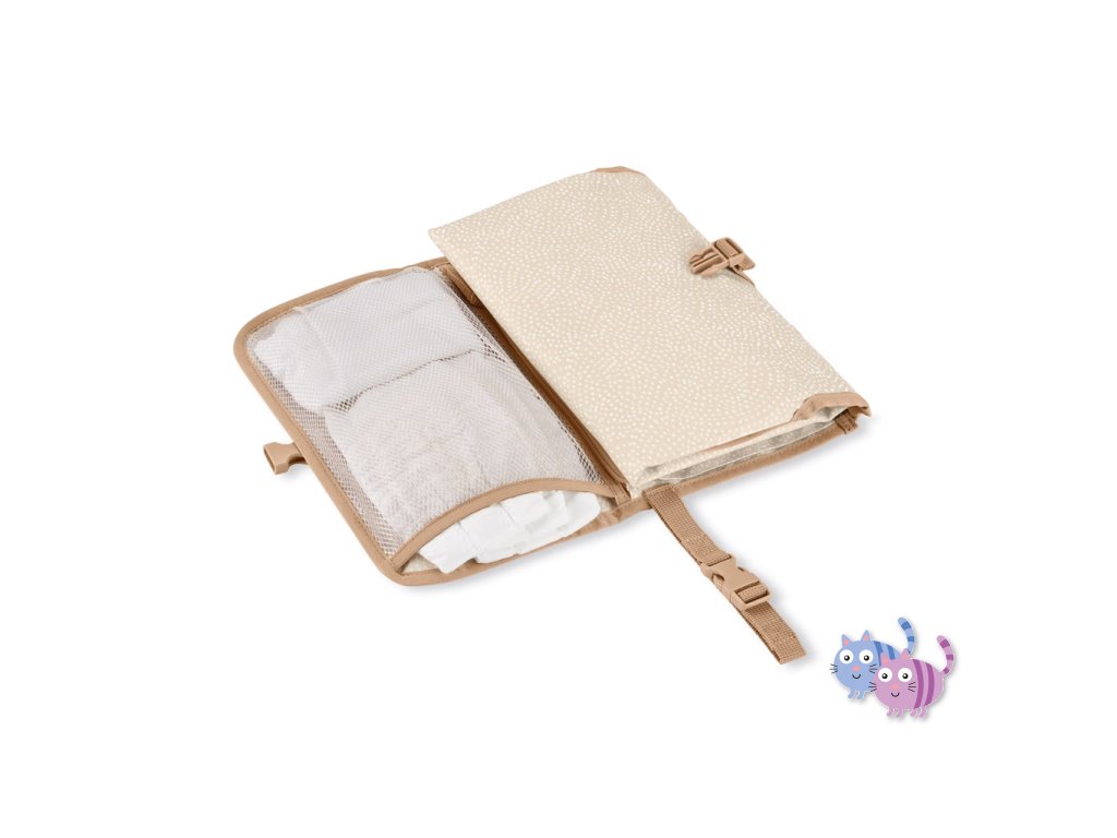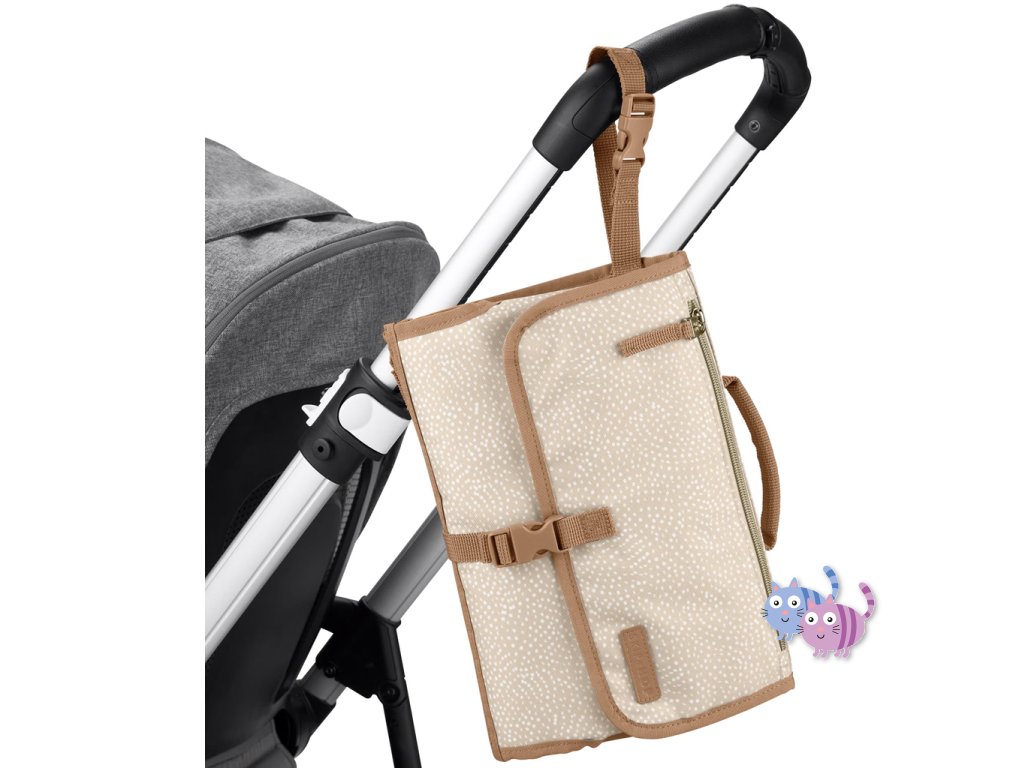 Dokonalá pomůcka na přebalování usnadňuje přebalování dětí bez ohledu na to, kde se právě nacházíte. Set obsahuje měkkou podložku na přebalování s možností odepnutí pomocí zipu a samostatnou taštičku na hygienické potřeby jako pleny, ubrousky, krém. Do velké síťované kapsy se vejdou až čtyři pleny plus krémy a další potřebné věci. Přední kapsa na zip je ideální na klíče, mobilní telefon nebo jiné osobní věci. Pronto jednoduše vložte do tašky, připněte si jej na zápěstí nebo jej připněte na kočárek a vyražte!