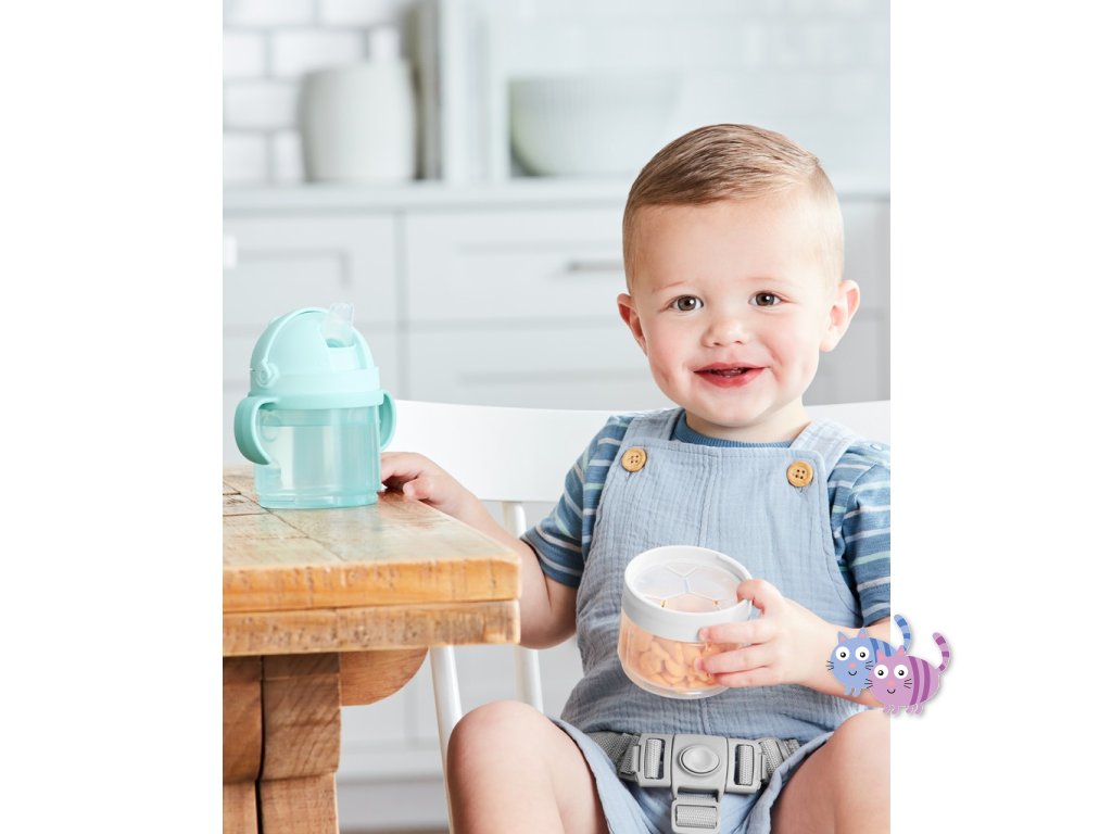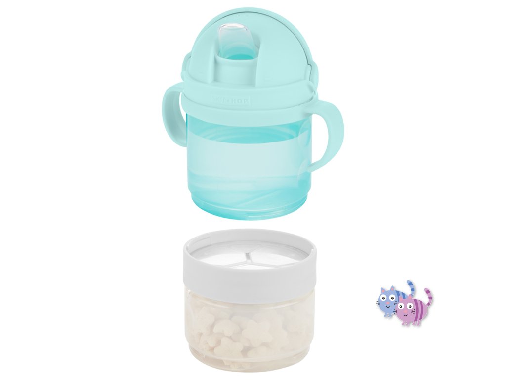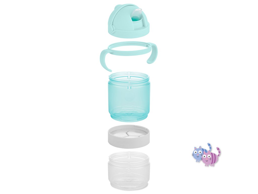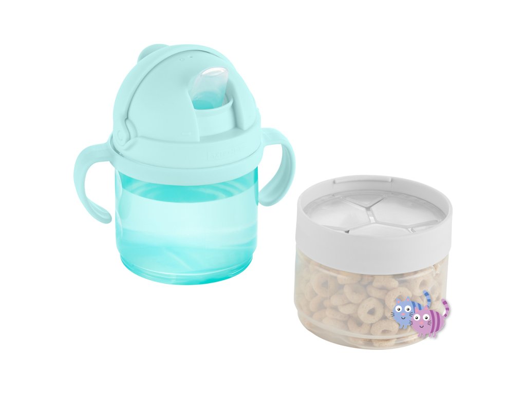 Tato praktická 5dílná sada na jídlo a pití pro miminka a batolata má specifický design pro stohování, čímž se přizpůsobí vašim měnícím se potřebám. Díky této sadě mohou vaše dětičky popíjet a mlsat doma i na cestách. Díky dvěma kompatibilně vyměnitelným otočným uzávěrům/víčkům, dvěma nádobám a volitelné rukojeti vám tato sada umožňuje používat jednotlivé komponenty samostatně nebo je naskládat dohromady. Naplňte je cereáliemi, sušenkami, ovocem, vodou, džusem a dalšími oblíbenými jídly vašeho drobečka a můžete jít do světa.