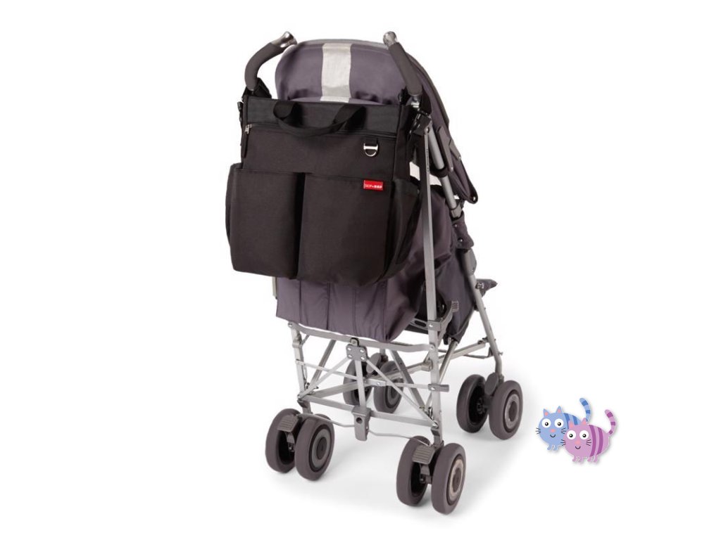 Přebalovací tašku SKIPHOP Duo Signature si snadno můžete pověsit na kočárek, perfektně vypadá ale i bez něj. Připínání a odepínání ke kočárku je skvěle vyřešeno, je snadné a zabere minimum času. Stačí odepnout menší přezku, obtočit pás kolem rukojeti kočárku a zajistit.