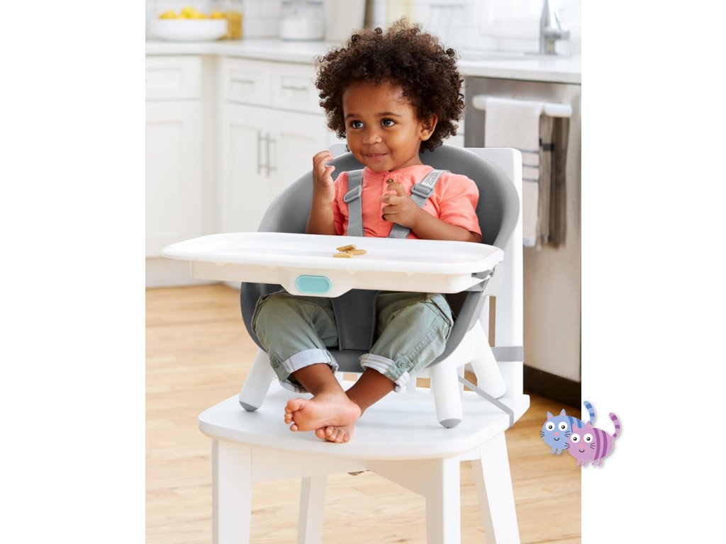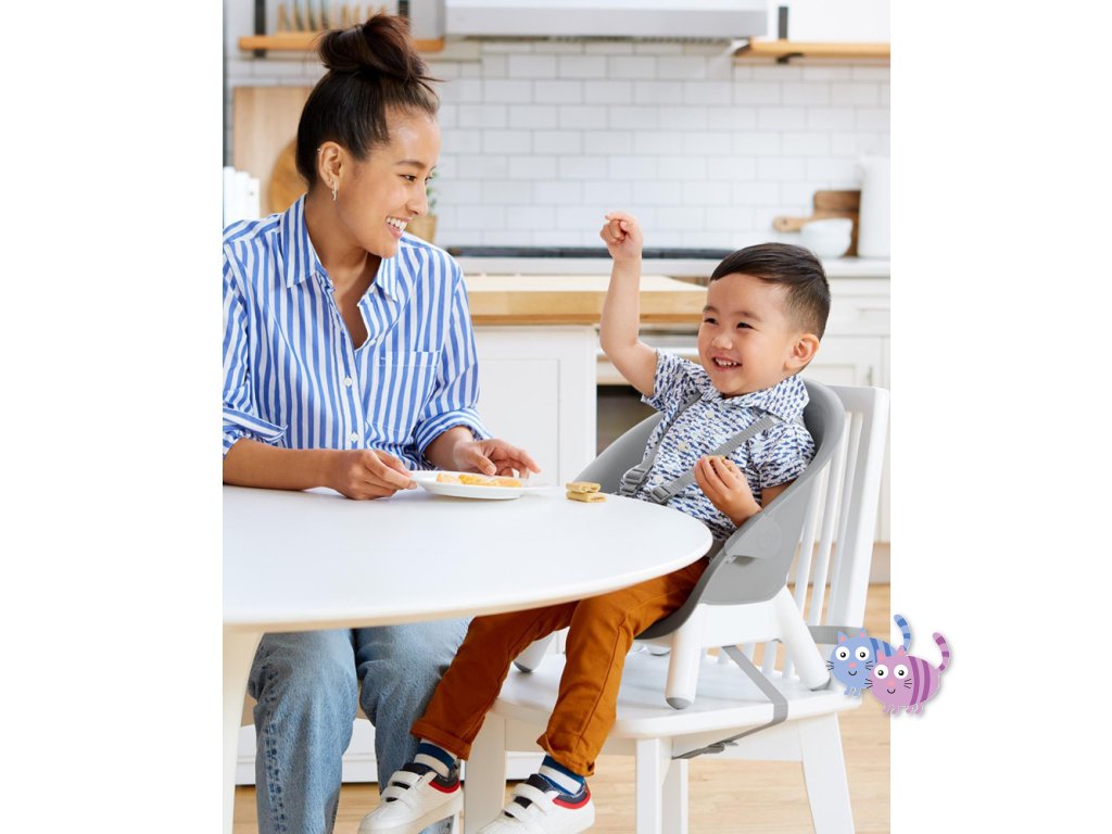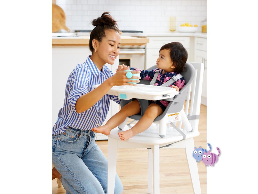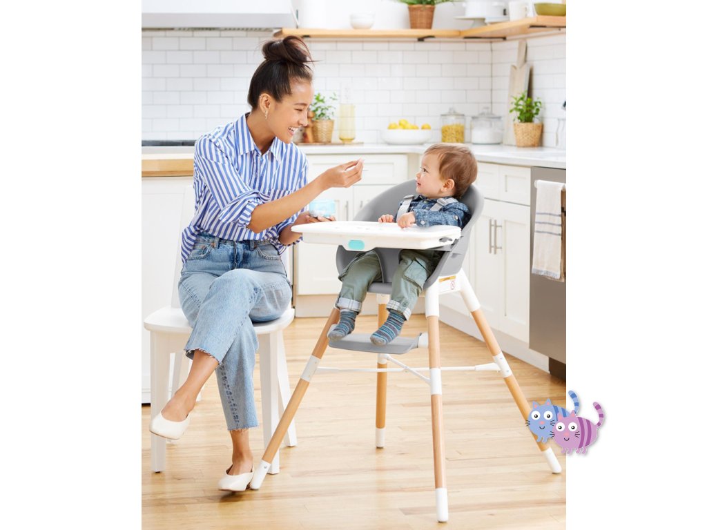 Jídelní židlička EON 4v1 se přizpůsobí věku a potřebám dítěte, takže ji můžete používat několik let. Elegantní, moderní a prostorově úsporný design dokonale zapadne do každého interiéru. Skip Hop EON má inovativní design s bukovými nohami, elegantním šedým sedadlem, vaničkou a dvoupolohovou šedou opěrkou nohou. Tác na vysoké židli je odnímatelný a nastavitelný. Židličku lze používat 4 různými způsoby: jako vysokou jídelní židličku do hmotnosti dítěte 15 kg, vysokou židličku s podnosem, samostatnou vysokou židličku pro jídlo u stolu a vysokou židličku nebo křesílko vhodné pro děti do 5 let nebo 36 kg.