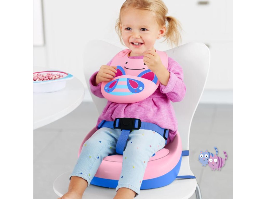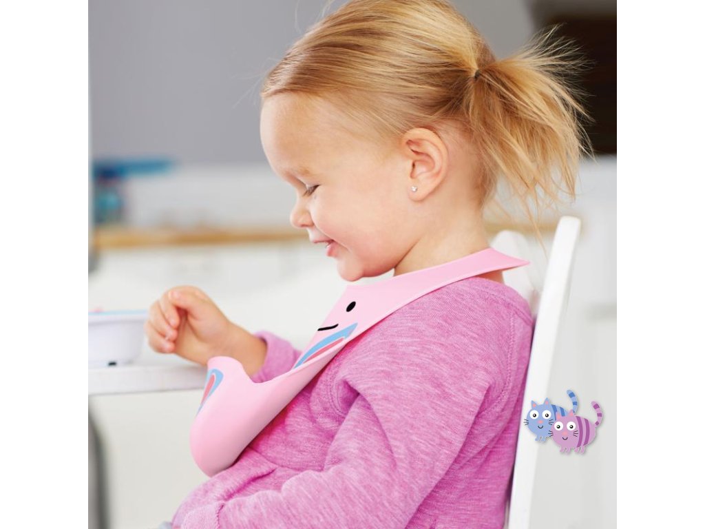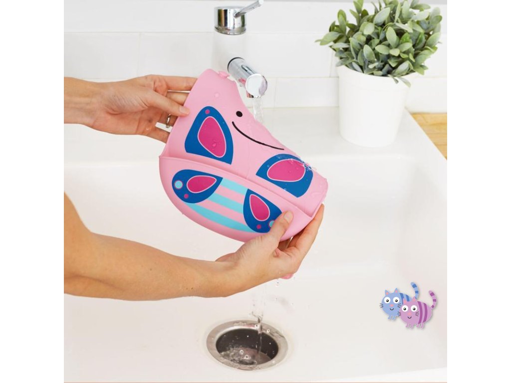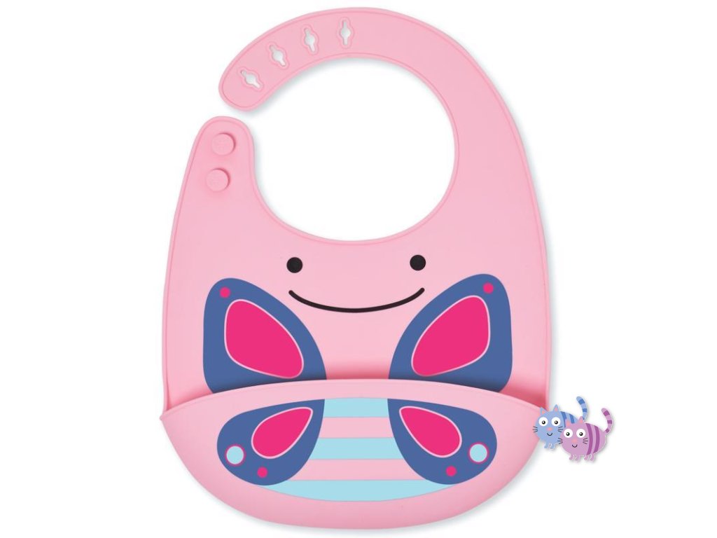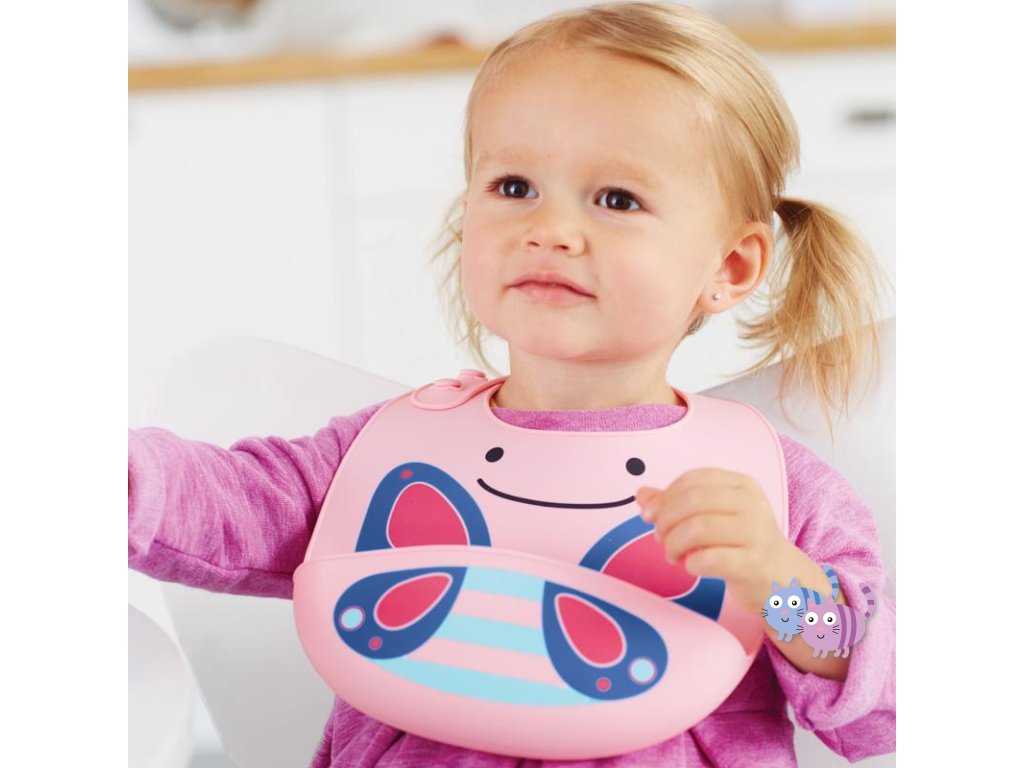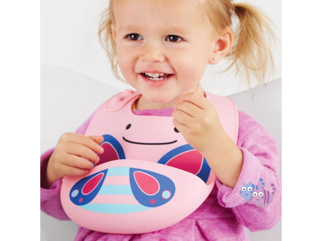 Silikonový bryndák Skip Hop z kolekce Zoo ve tvaru zvířátka. Bryndák zachytí padající jídlo od nezbedných jedlíků.