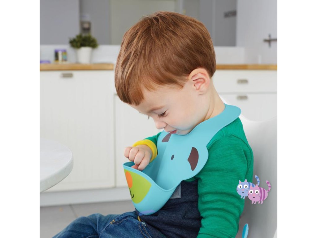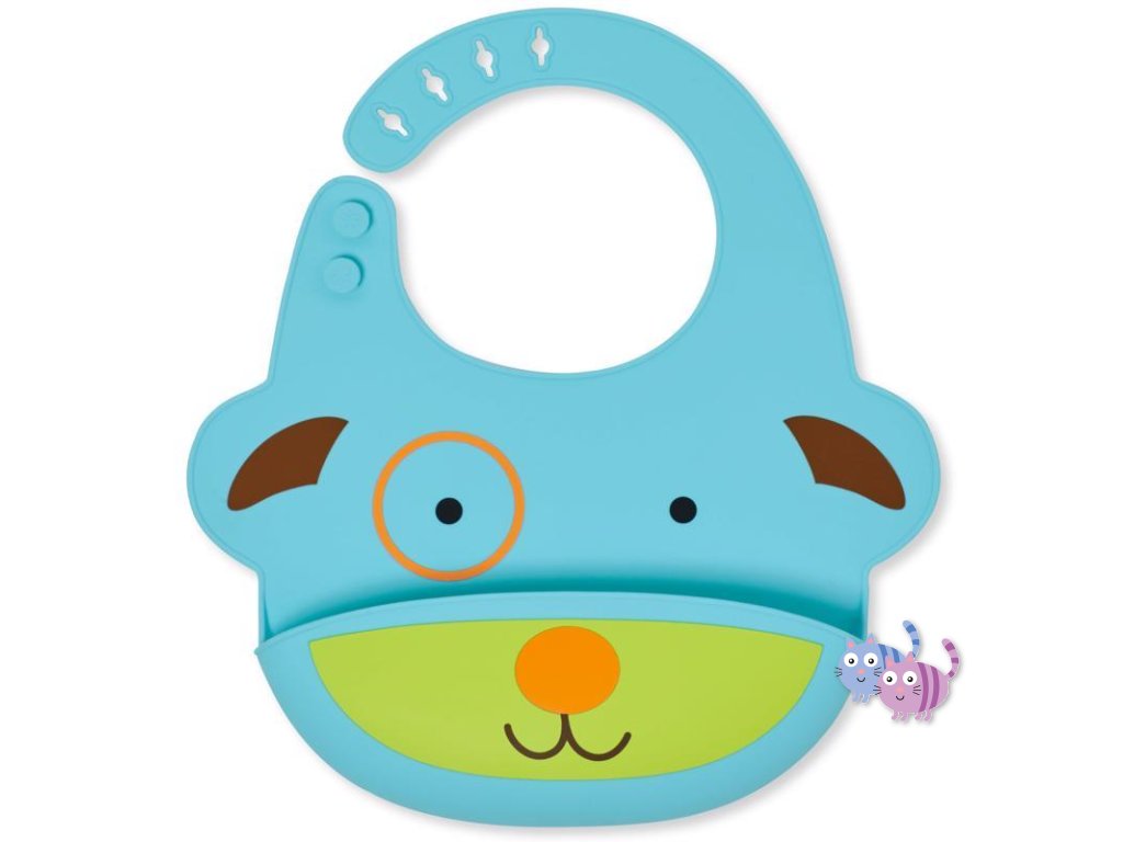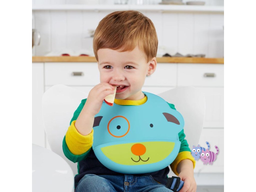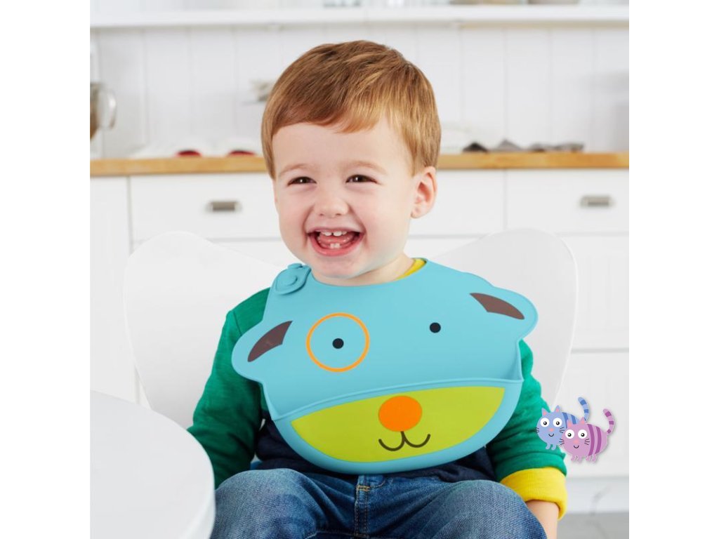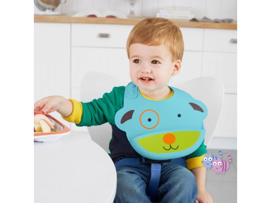 Silikonový bryndák Skip Hop z kolekce Zoo ve tvaru zvířátka. Bryndák zachytí padající jídlo od nezbedných jedlíků.