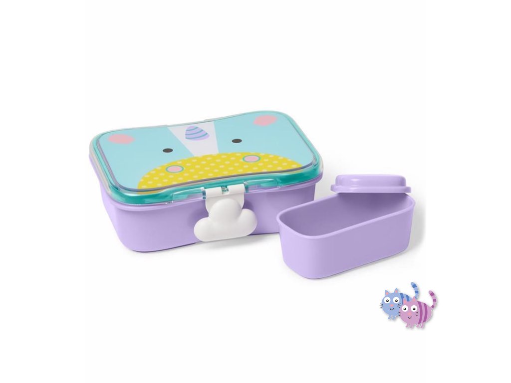 Krásná krabička na svačinu ve stylu Skip Hop, v designu Zoo kolekce, skládá se ze 2 dílů: krabička na svačinu s nepropustným víčkem a menší krabička na piškoty.