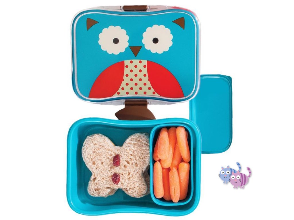 Krásná krabička na svačinu ve stylu Skip Hop, v designu Zoo kolekce, skládá se ze 2 dílů: krabička na svačinu s nepropustným víčkem a menší krabička na piškoty.