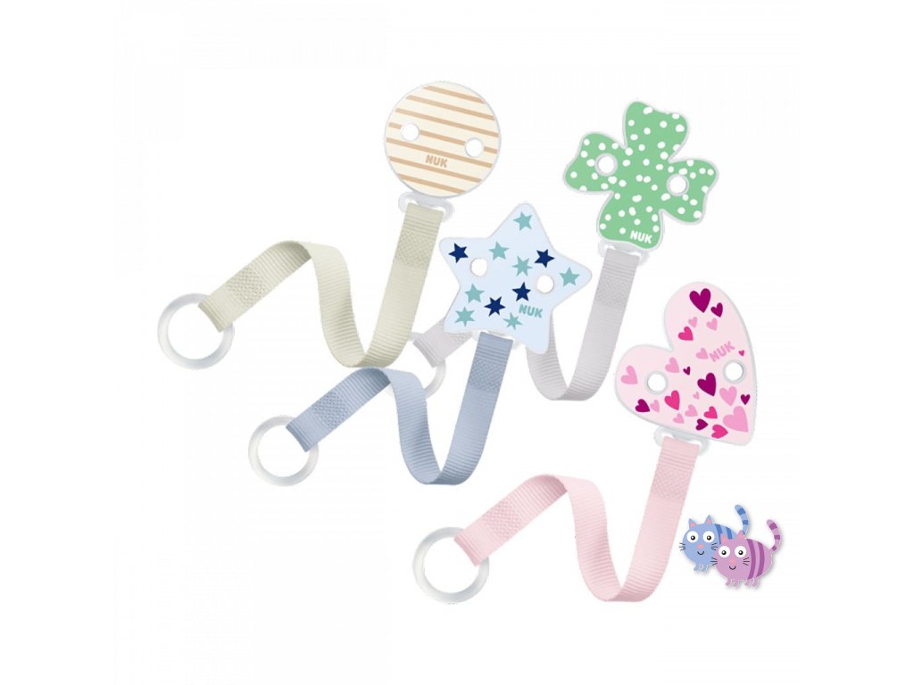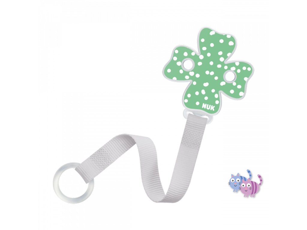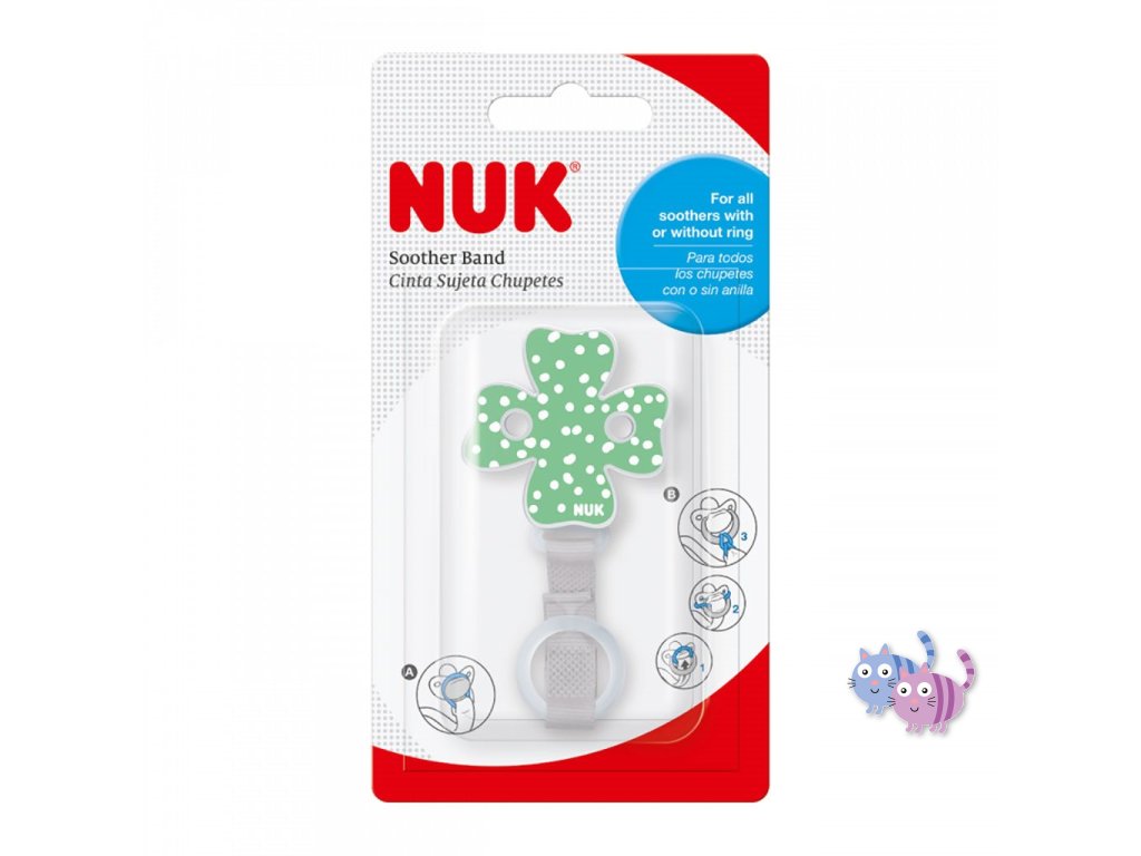 Veselá, barevná stužka na dudlík NUK s flexibilním kroužkem. Díky sponě dudlík nespadne na zem a nezašpiní se a neztratí se. Má snadné použití a je vyrobena tak, aby se dala připnout k dětskému oblečení. Určeno pro děti od prvních dnů života. Stužka je vhodná i na dudlíky bez kroužku díky natahovacímu silikonovému kroužku. Systém klipu je bez ostrých hran pro otevírání a zavírání jednou rukou.