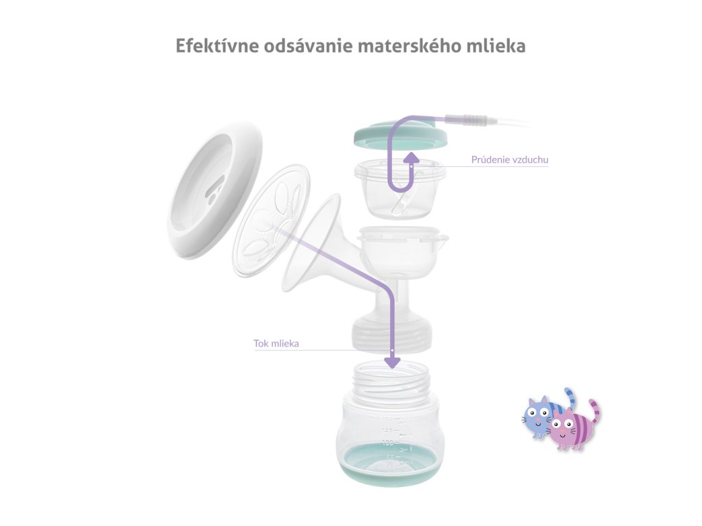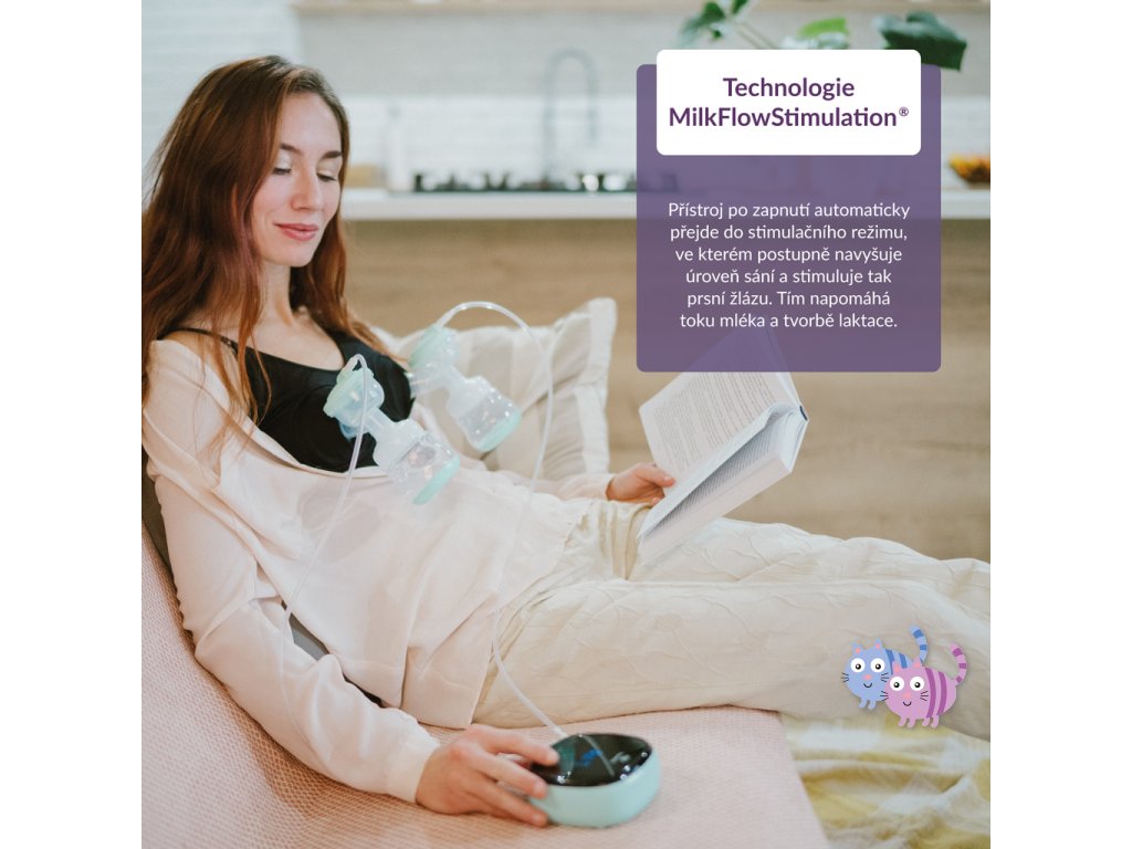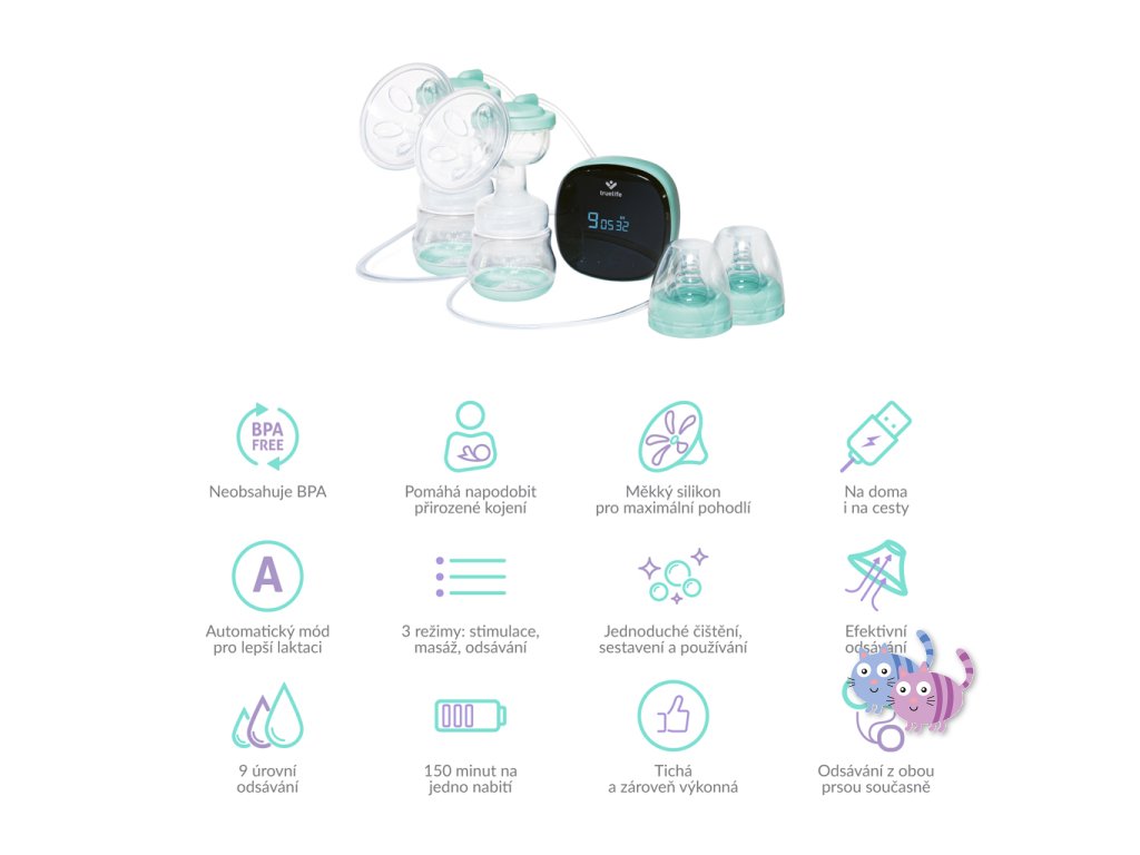 - vlastnosti a funkce: bez BPA, 2fázové odsávání, možnost nastavení intenzity odsávání - 9 úrovní, 3 režimy – odsávání, stimulace, masáž, technologie MilkFlowStimulation®, časovač pro automatické vypnutí, zásobník na mléko 2× 150 ml, výdrž 150 minut, elektrický pohon, zamezení zpětného toku, LED displej s dotykovými tlačítky, tichý chod, ergonomický design, nízká hmotnost.