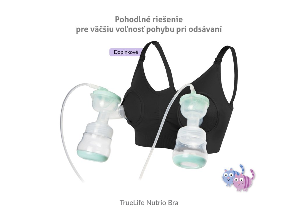 K odsávačce lze dokoupit speciální podprsenku TrueLife Nutrio Bra, která uchytí odsávačku k prsům. Vy tak máte volné ruce a můžete pohodlně přepínat mezi jednotlivými režimy a úrovněmi sání, nebo se věnovat jiným činnostem. Nutrio Bra zároveň slouží i jako běžná kojící podprsenka, takže ji můžete nosit celý den. Podprsenka je dostupná ve čtyřech velikostech a lze ji dokoupit jako příslušenství k odsávačce.