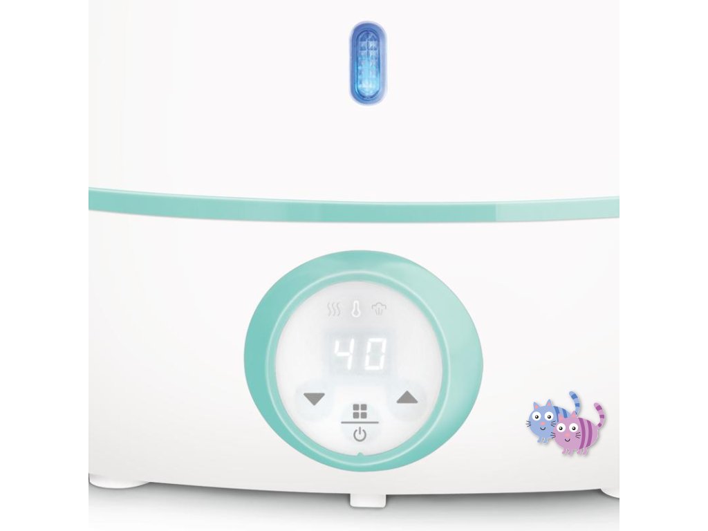 Kromě funkce rychlého ohřevu mléka a dětských příkrmů ohřívač disponuje i funkcí sterilizace. Nemusíte tedy pořizovat další přístroje, abyste udrželi lahvičky a dudlíky vašeho miminka v čistotě. Mód sterilizace zvolíte trojím stisknutím tlačítka na ovládacím panelu. Keep Warm funkce se stará o udržování konstantní teploty mléka v lahvičce, konkrétně 37 °C. Výši teploty si dle potřeby můžete upravit pomocí tlačítek + a – na ovládacím panelu.