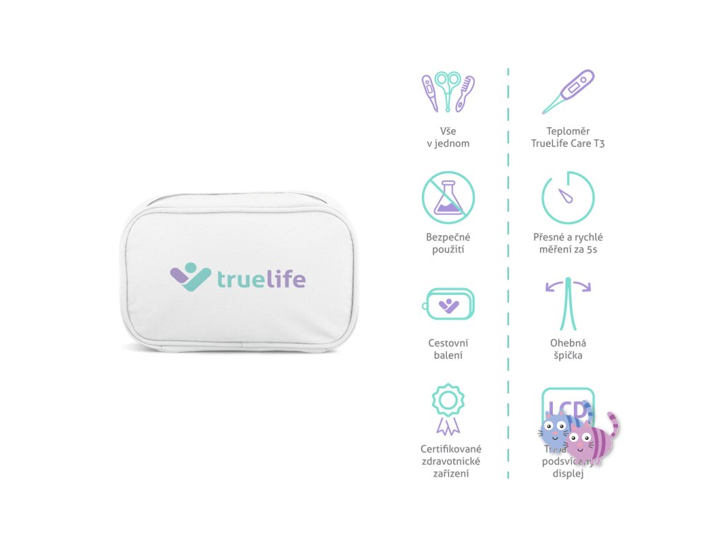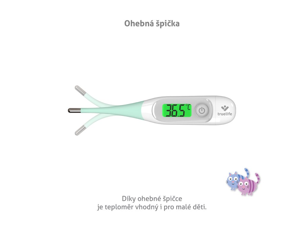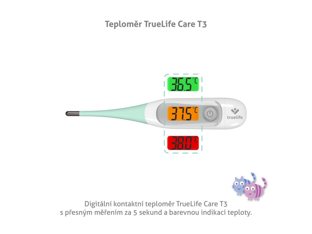 Zdraví dítěte ohlídá digitální teploměr TrueLife Care T3, který změří teplotu naprosto přesně již za 5 vteřin na některém z těchto tří míst: podpaží, ústa či konečník. Měřit jím lze i teplotu vodní lázně, stačí zvolit příslušný mód. Naměřené hodnoty ihned vidíte na podsvíceném displeji, který mění barvu v závislosti na naměřené teplotě. Zelená znamená normální teplotu, oranžová zvýšenou a červená signalizuje horečku. Teploměr neobsahuje rtuť ani žádné škodlivé látky a jeho ohebná špička je šetrná k pokožce miminek.