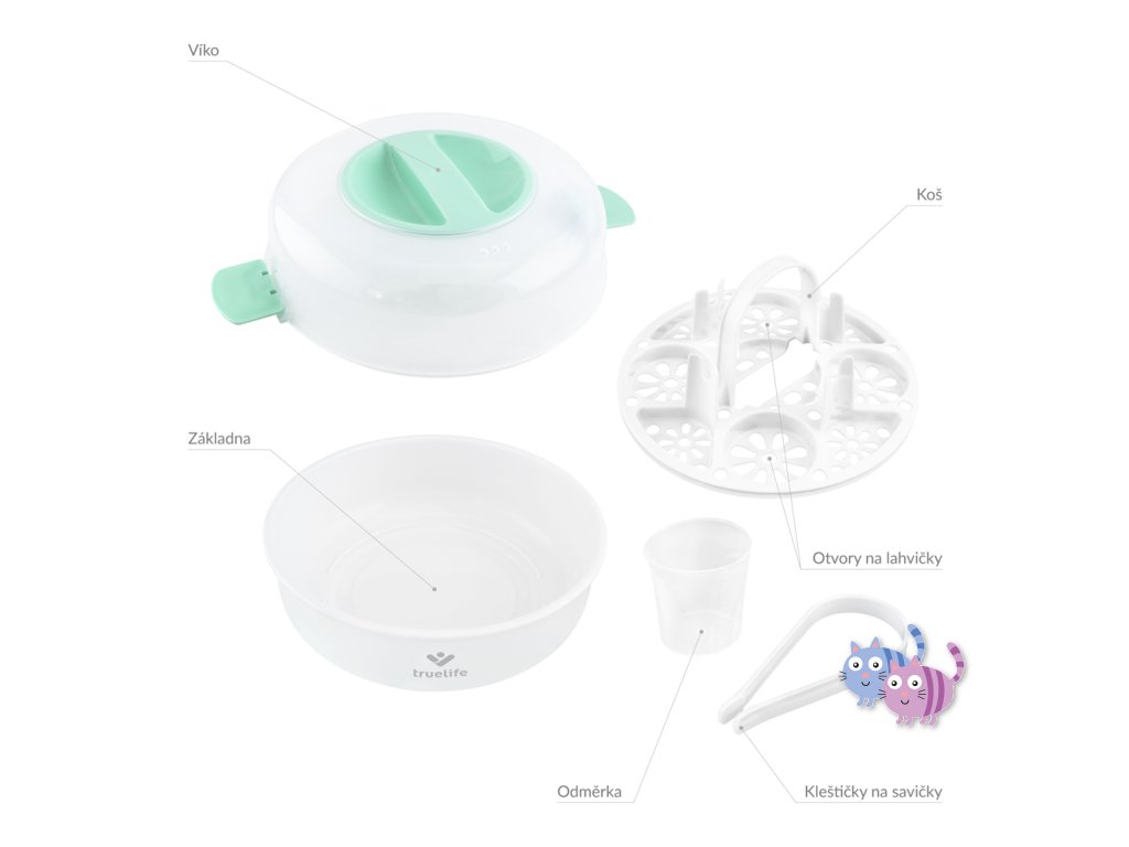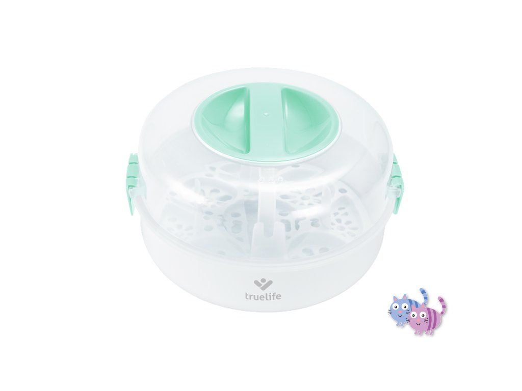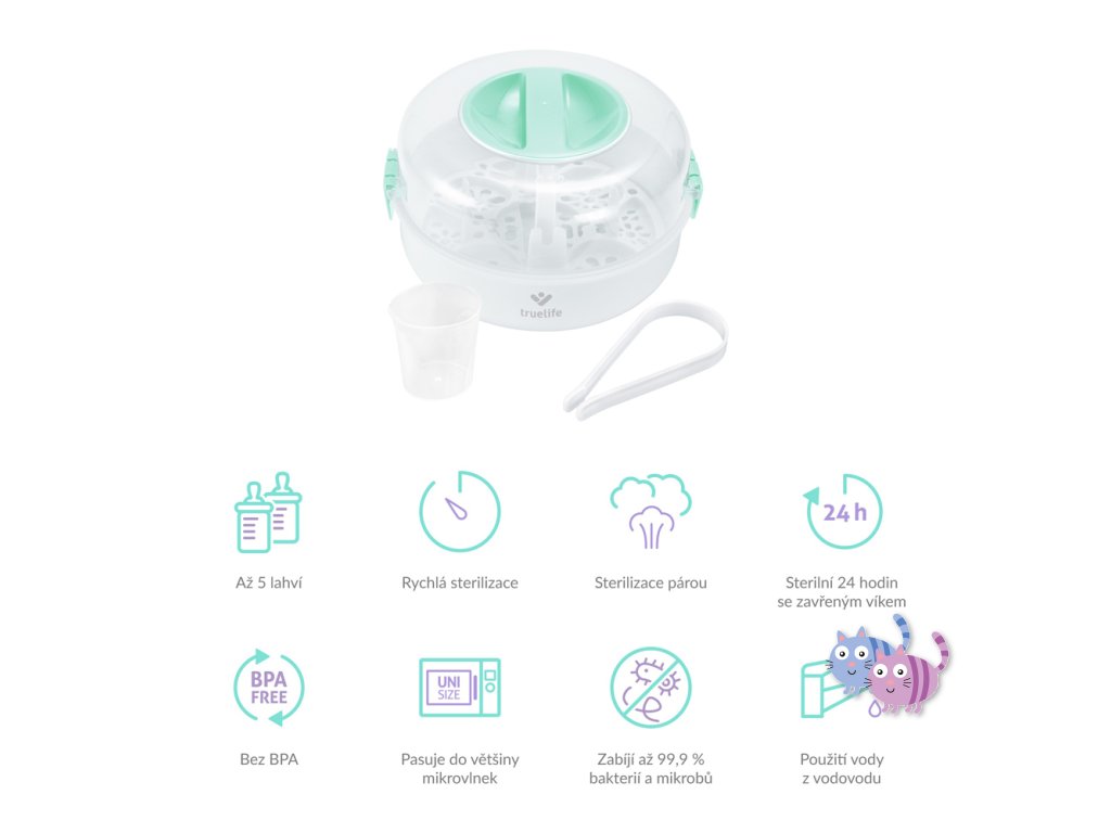 Ochrana imunitního systému vašeho dítěte pro vás nemusí znamenat neustálé vyvařování lahviček a dudlíků. Se sterilizátorem do mikrovlnné trouby TrueLife Invio MS5 sterilizujete dětské lahvičky, kousátka a další předměty během dvou minut. K tomu potřebujete jen obyčejnou vodu a mikrovlnnou troubu. Sterilizátor využívá nemocniční metodu parní sterilizace, která je rychlá, účinná a bez chemických látek. Ničí tak 99,9 % bakterií a mikrobů, které se na dětských předmětech nacházejí, aniž by poškodil jejich povrch. Sterilizátor je navržen pro většinu mikrovlnných trub na trhu a zvládne většinu typů kojeneckých lahví. Pojme až 5 lahviček naráz a snadno se ovládá. Díky kompaktním rozměrům s ním můžete bez problému cestovat.