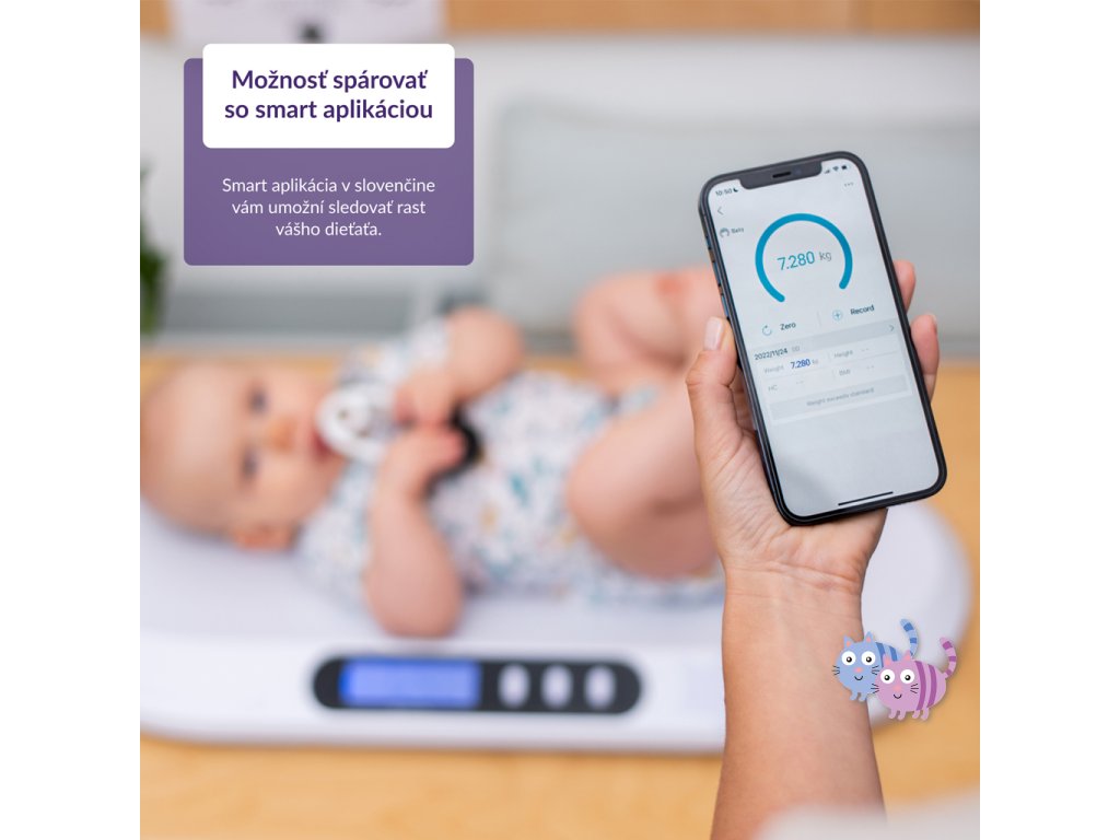 Stáhněte si smart aplikaci, která je dostupná kompletně v češtině, a sledujte růst a vývoj dítěte v čase. Aplikace poskytuje přehlednou historii měření, ze kterých vyplývá jasná informace jak miminko přibírá a roste. Zároveň dokáže z dat vytvořit graf vývoje a jejím prostřednictvím lze ovládat funkce TARE nebo HOLD. Váhu lze používat jak s využitím aplikace, tak i bez ní.