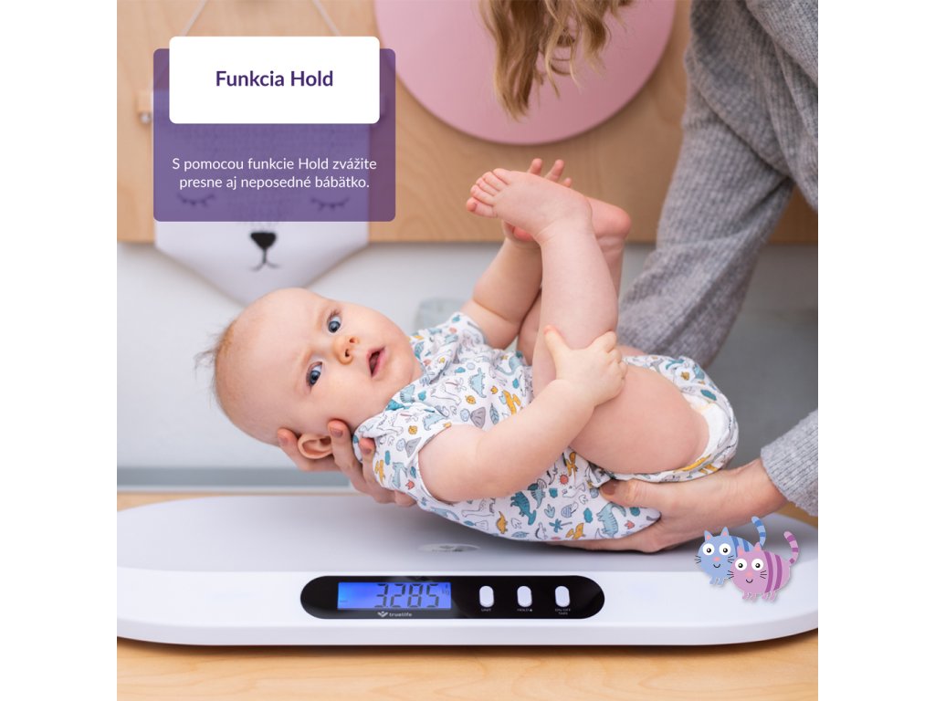 - Neposedná miminka zvážíte díky funkci HOLD. Hmotnost se uzamkne ve chvíli, kdy se dítě nejméně pohybuje.