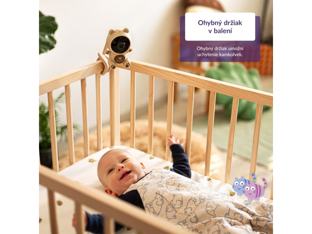 Chůva svým unikátním designem dokonale doplní interiér dětského pokojíčku a nijak děťátko neruší. Kamera umístěná v silikonovém těle ve tvaru medvídka naprosto nenápadně drží nepřetržitě stráž. Chůvičku lze postavit nebo využít přiložený ohebný držák, který kamkoli přichytíte, například na rám postýlky.