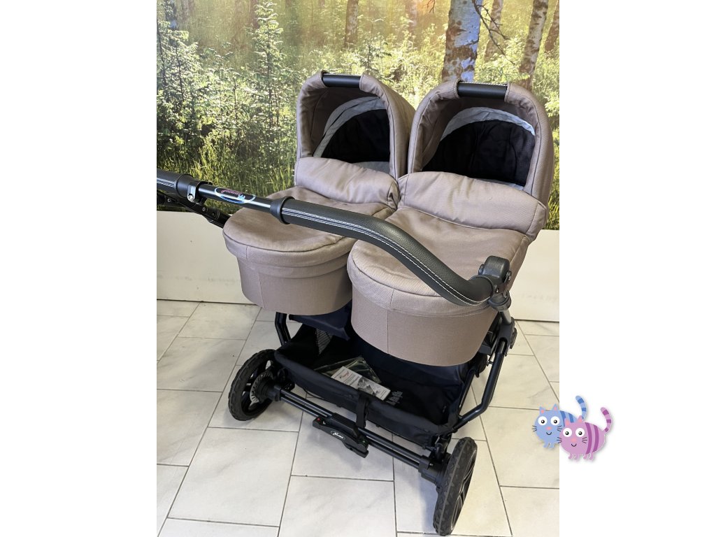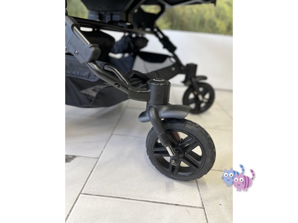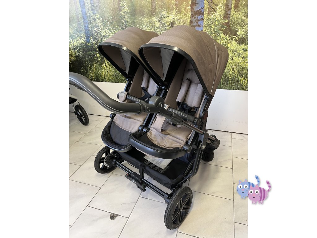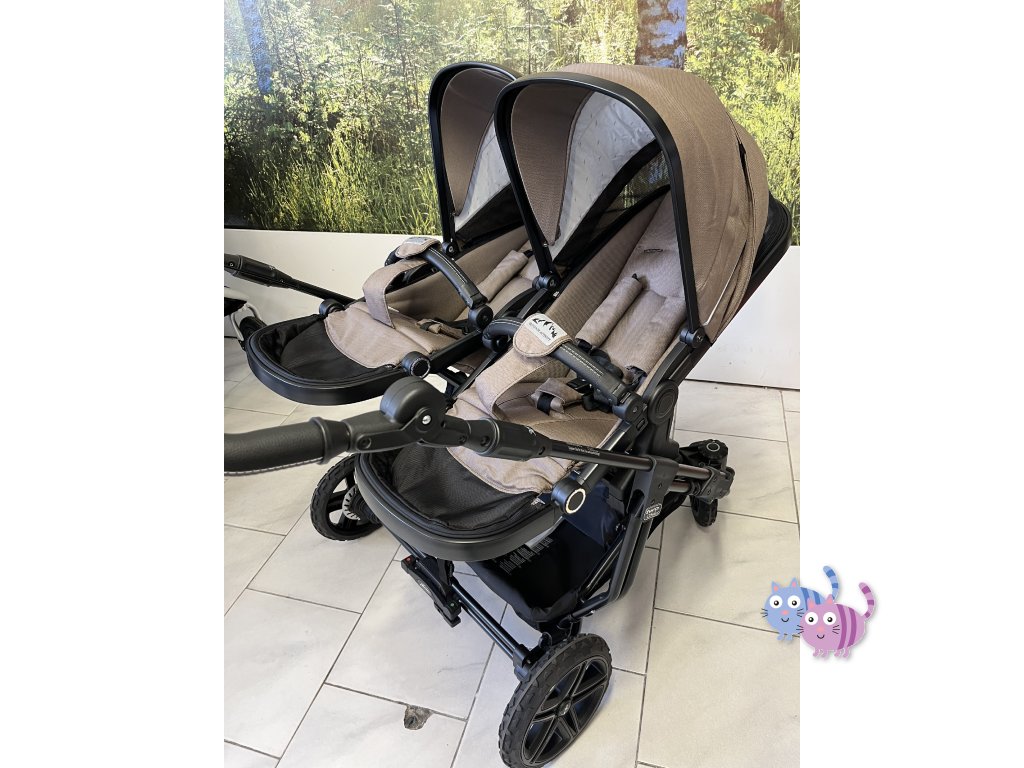 Kočárek měří na šířku 79,5 cm. Dá se na něj nacvaknout 2 autosedačky (po dokoupení adaptérů), 2 korby nebo 2 sportovní sedačky různými směry.